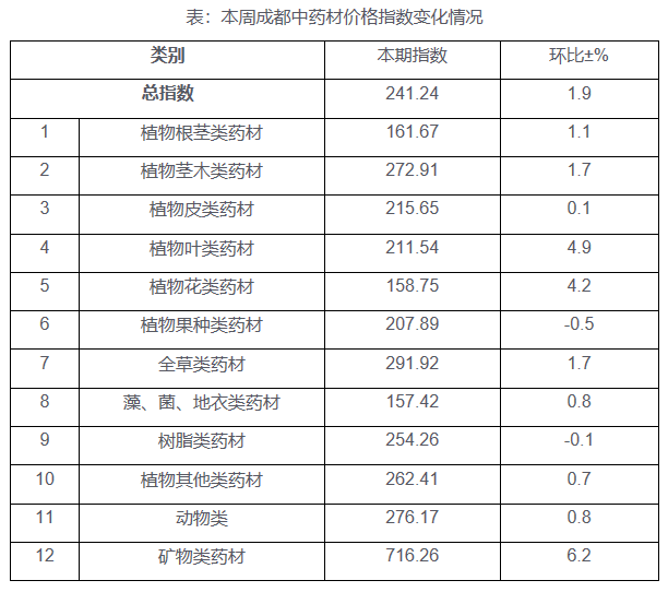 据对成都中药材市场价格监测显示,10月第5期成都中药材价格指数为241.24点(以2010年8-9月份平均价格为基期),与前一周相比上涨1.9%。组成成都中药材价格指数的12类分类指数呈现“10涨2跌”的态势,其中,植物根茎类、植物皮类、植物花类、全草类、藻菌地衣类价格指数分别为161.67点、215.65点、158.75点、291.92点和157.42点,与上周相比,植物根茎类、植物皮类、植物花类、全草类、藻菌地衣类分别上涨1.1%、0.1%、4.2%、1.7%、0.8%。
