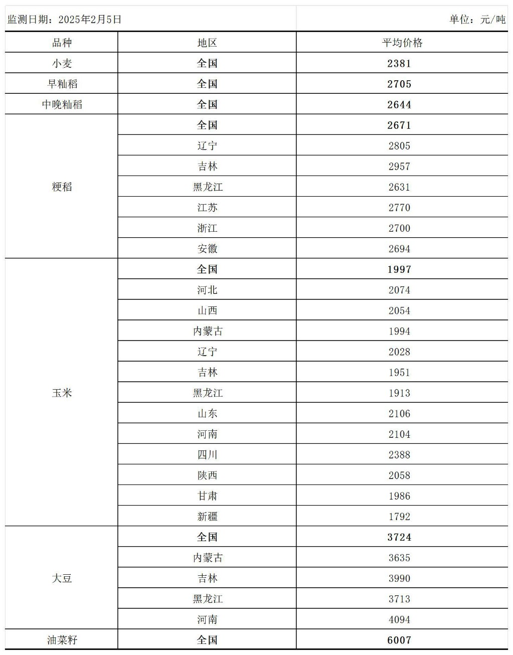 全国主要粮食品种收购价格周报(2月6日)