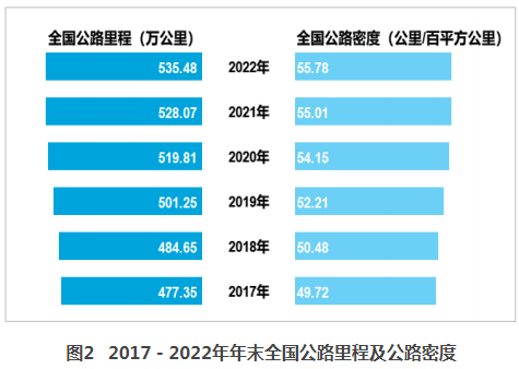 年末全国公路里程535.48万公里,比上年末增加7.41万公里。公路密度55.78公里/百平方公里,增加0.77公里/百平方公里。公路养护里程535.03万公里,占公路里程比重为99.9%。