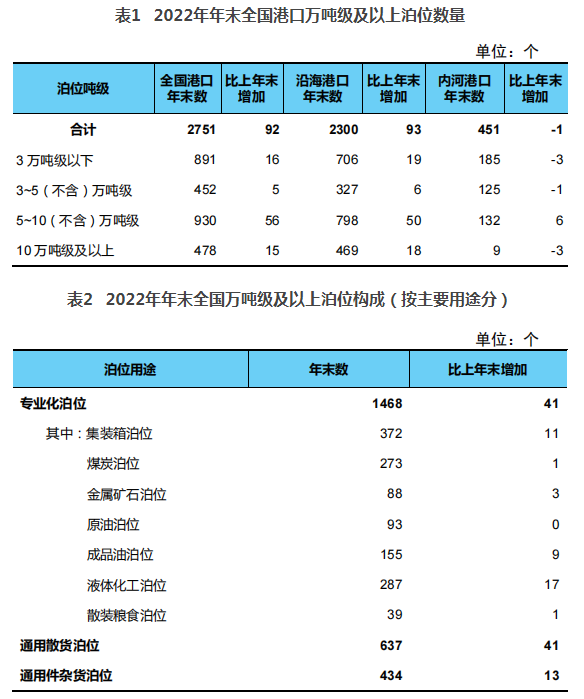 年末全国港口万吨级及以上泊位2751个,比上年末增加92个。从分布结构看,沿海港口万吨级及以上泊位2300个、增加93个,内河港口万吨级及以上泊位451个、减少1个。从用途结构看,专业化万吨级及以上泊位1468个、增加41个,通用散货万吨级及以上泊位637个、增加41个,通用件杂货泊位434个、增加13个。