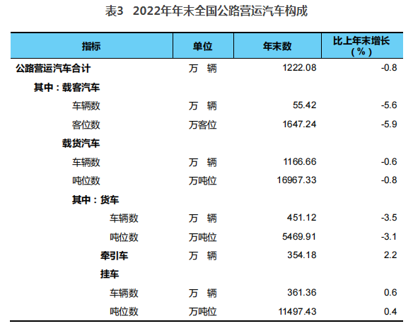 年末全国拥有公路营运汽车1222.08万辆。分结构看,拥有载客汽车55.42万辆、1647.24万客位,比上年末分别减少3.28万辆、103.79万客位;拥有载货汽车1166.66万辆、16967.33万吨位,分别减少6.60万辆、132.17万吨位,其中,普通货车387.69万辆、4716.19万吨位,分别减少19.25万辆、207.24万吨位,专用货车63.43万辆、753.72万吨位,分别增加3.05万辆、34.96万吨位,牵引车354.18万辆、增加7.50万辆,挂车361.36万辆、增加2.11万辆。
