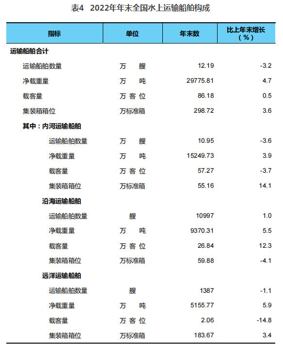 年末全国拥有水上运输船舶12.19万艘,比上年末减少0.40万艘,净载重量2.98亿吨、增加0.13亿吨,载客量86.18万客位、增加0.40万客位,集装箱箱位298.72万标准箱、增加10.29万标准箱。