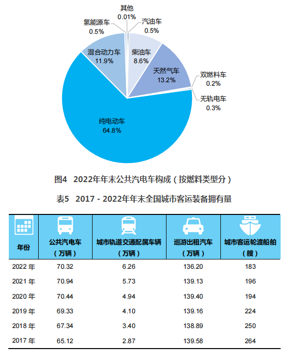 年末全国拥有公共汽电车70.32万辆,比上年末减少0.63万辆,其中纯电动车45.55万辆、增加3.59万辆,占公共汽电车比重为64.8%、提高5.6个百分点。拥有城市轨道交通配属车辆6.26万辆,增加0.53万辆。拥有巡游出租汽车136.20万辆,减少2.93万辆。拥有城市客运轮渡船舶183艘。