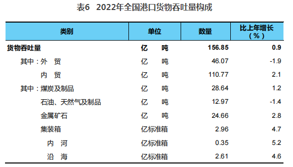 全年完成港口货物吞吐量156.85亿吨,比上年增长0.9%。其中,沿海港口货物吞吐量101.31亿吨、增长1.6%,内河港口货物吞吐量55.54亿吨、下降0.3%;外贸货物吞吐量46.07亿吨、下降1.9%,内贸货物吞吐量110.77亿吨、增长2.1%。完成集装箱吞吐量2.96亿标准箱,增长4.7%。完成集装箱铁水联运量874.70万标准箱,增长16.0%。