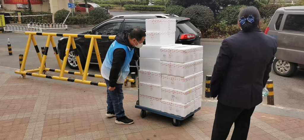 第三次抗疫。2022年11月,新一轮疫情来袭。我接到了转战指令,从荷塘区的黄家塘社区来到了天元区的佳美社区佳兆业小区,任务也从核酸检测秩序维护转换成社区物资保障。在佳兆业三期的唯一出入通道上,划定了物资消毒区、中转区。对4000多位居民采购的生活物资进行消毒、转运,保障居民的正常生活需求。在中转区短短20米的距离上,核对检测清单,一天下来,嗓子哑了,腰直不起了,腿也迈不动了。