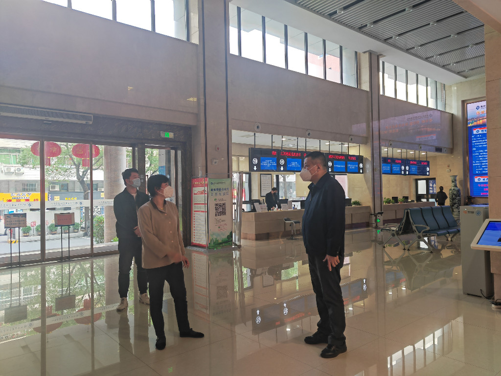 洪伟组长一行察看了交易中心入口执勤及交易大厅的消杀情况,询问了疫情防控期间办事流程,并与市公共资源交易中心党组书记、主任杨泽民,以及市交易中心相关科室负责人进行现场办公。