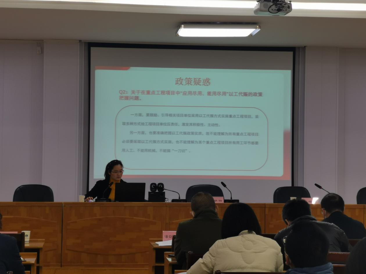 随后,市发改委农村经济科彭益以《重点工程项目以工代赈政策》为题进行了专题培训并做互动交流,围绕以工代赈政策的历史沿革及重大意义、《工作方案》重点解读、国省市县工作部署、以工代赈政策疑惑等四个方面进行了系统的阐述,同时结合实例分析了以工代赈常见问题,对谋划、实施以工代赈项目提供了可供参考和借鉴的经验做法。现场讨论交流氛围热烈,通过共同学习,大家对以工代赈政策有了更深刻的认识。