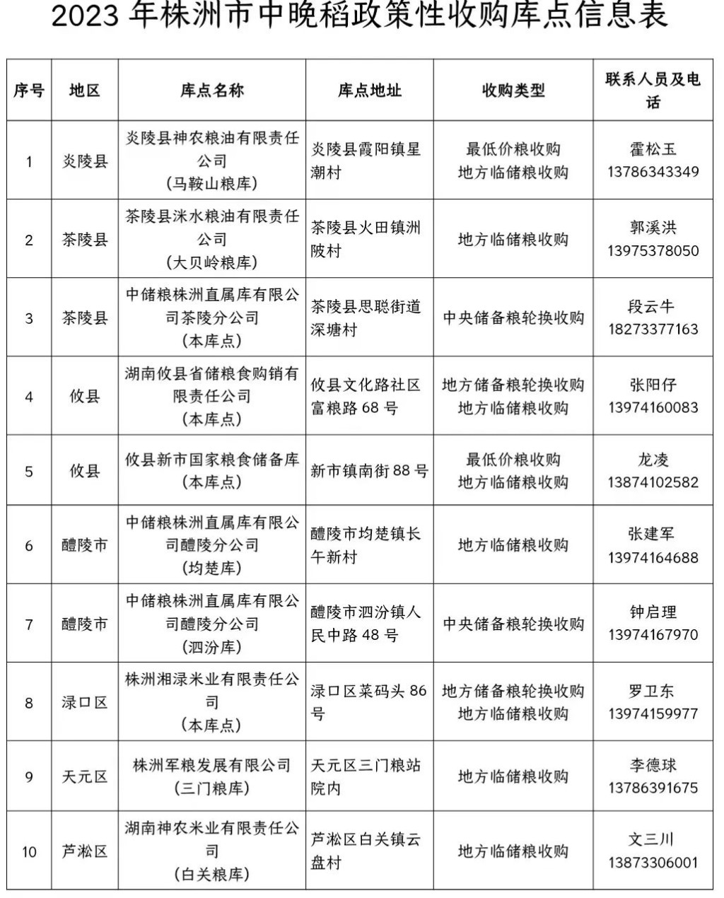 为切实做好2023年中晚稻收购工作,现将株洲中晚稻政策性收购库点及监督举报、政策咨询电话公示如下,广大群众可前往就近点售粮,并请对各库点收购行为及服务进行监督。