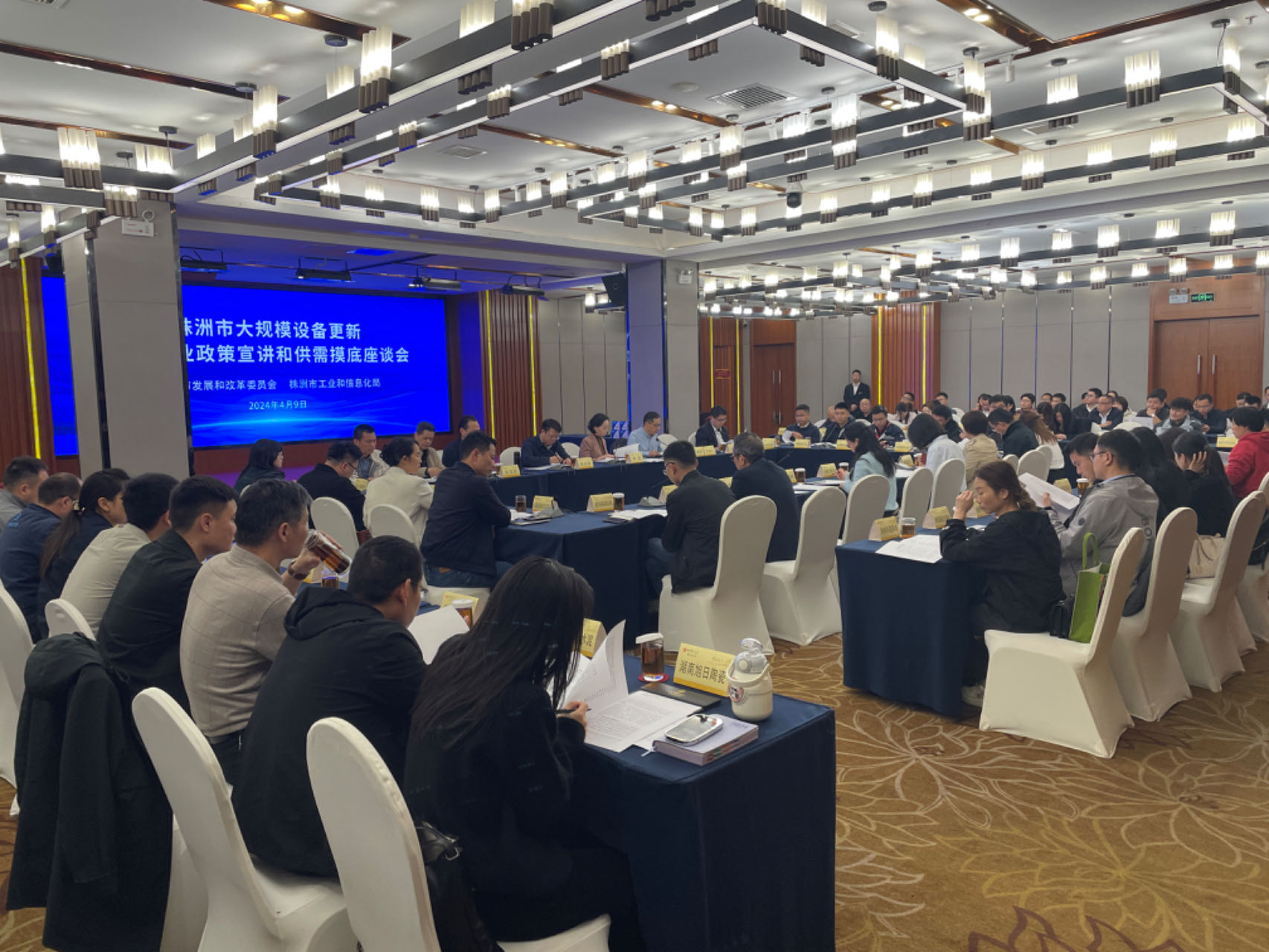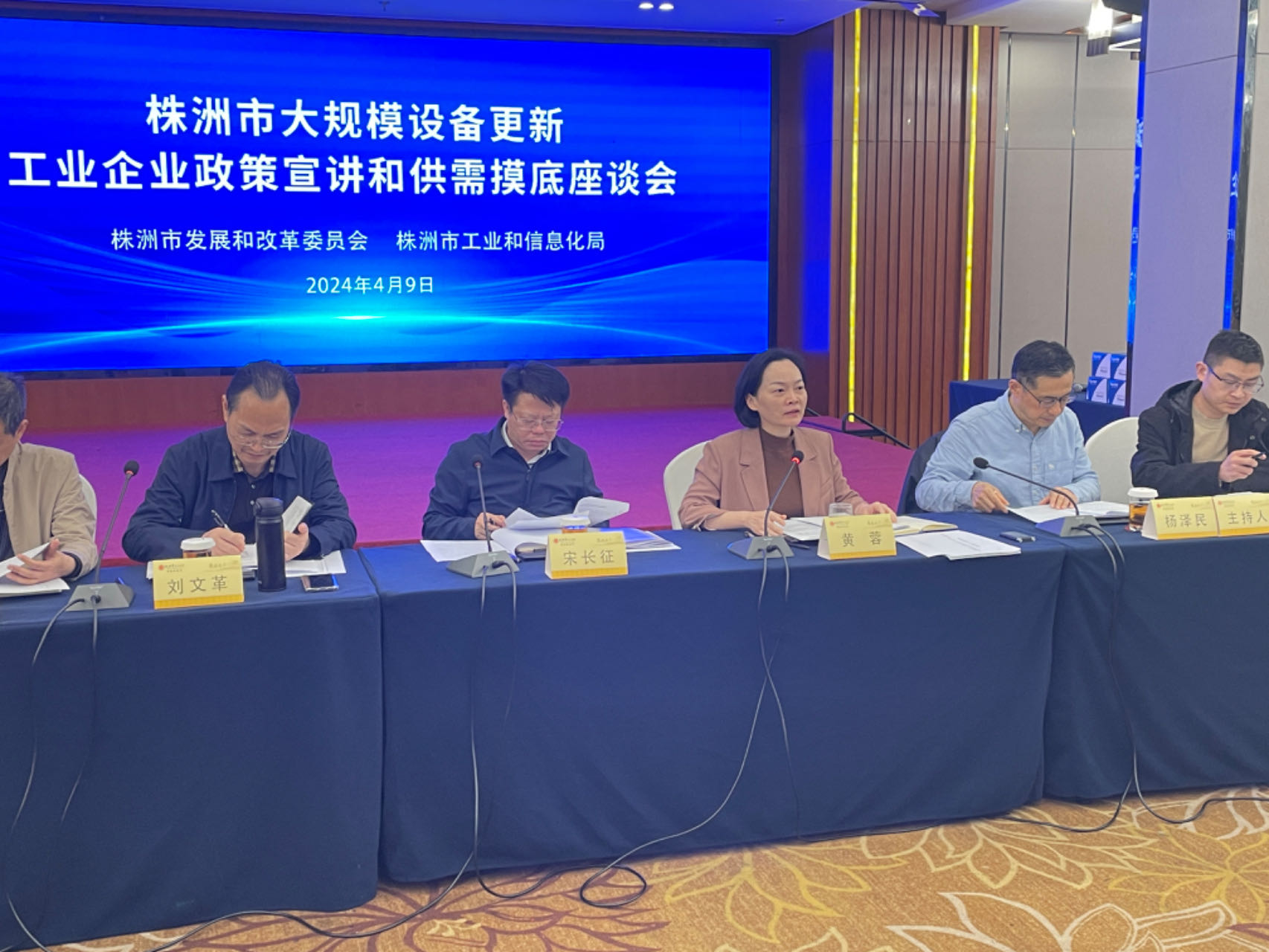 4月9日下午,市发改委会同市工信局、人民银行株洲市分行组织召开株洲市大规模设备更新工业企业政策宣讲和供需摸底座谈会。全市重点行业企业和部分专精特新企业等90余家企业参会。市发改委党组书记、主任黄蓉同志、市工信局党组书记、局长宋长征同志、人民银行株洲市分行副行长刘文革同志出席会议。