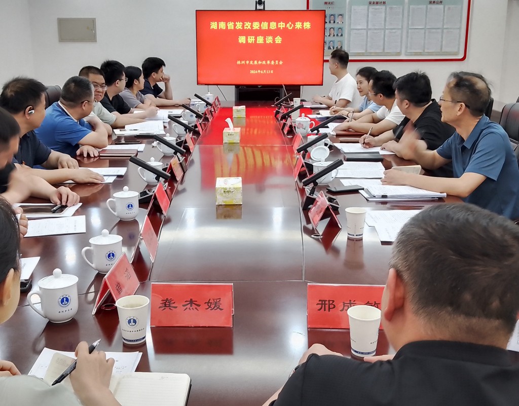 2024年6月13日,省发改委信息中心主任田拥军一行来株调研。市发改委党组成员、副主任周成德主持座谈。市数据局副局长莫立丰、市投资服务中心主任肖冬亮参加调研。