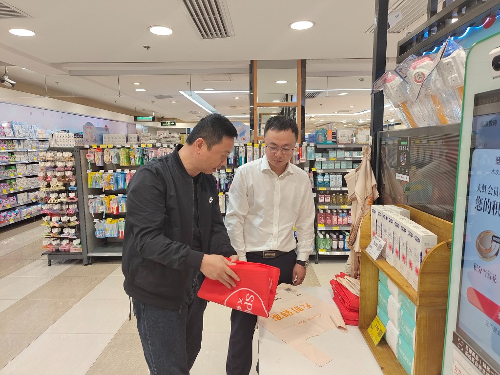 戴主任一行还检查了商超塑料污染治理工作的落实情况,天虹等商超能够较好的执行相关要求,没有销售塑料棒棉签等用品,大力推进可降解塑料袋或可循环布袋的使用。