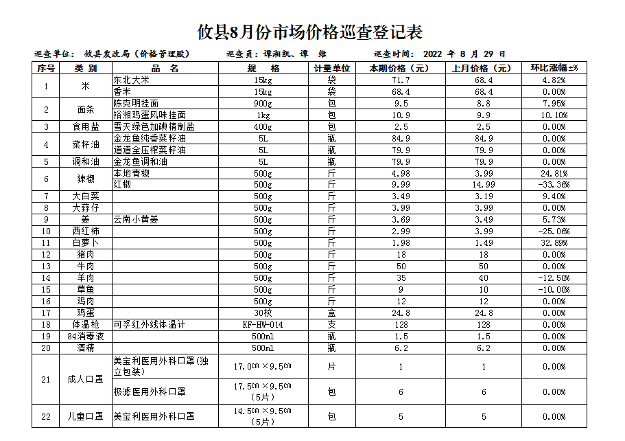 从巡查情况看,攸县重要民生商品市场供应充足,交易秩序平稳,价格基本稳定,能够保证居民正常生活需求。米、面价格小幅上涨,食用油价格稳定;受炎热气温影响,我县蔬菜供应充足,价格季节性波动;羊肉、草鱼价格下跌,其它禽类、鸡蛋价格稳定;防疫物资价格平稳,货源充足。(详见文末附件——攸县8月份市场价格巡查登记表)