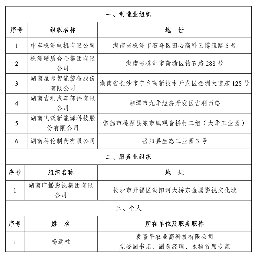 根据《湖南省省长质量奖管理办法》规定,在组织和个人自愿申报、各市州人民政府推荐基础上,湖南省省长质量奖评审委员会办公室完成了初审核查、受理公示、材料评审、现场评审、顾客满意度测评、综合评价等环节工作。经过湖南省省长质量奖评审委员会全体委员审议与投票,中车株洲电机有限公司等组织和袁隆平农业高科技股份有限公司杨远柱同志进入第七届湖南省省长质量奖建议名单,湖南晓光汽车模具有限公司等组织进入第七届湖南省省长质量奖提名奖建议名单。现予以公示,广泛听取意见,接受社会监督。如有异议,请于2022年8月16日18:00前,以电话、传真、电子邮件等形式向湖南省省长质量奖评审委员会办公室或省纪委监委驻省市场监督管理局纪检监察组反映,同时请用真实姓名、单位,并注明联系方式。