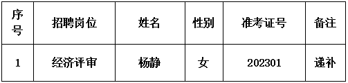 根据《株洲市发展和改革委员会2023年公开招聘项目评审专业技术人员公告》及有关规定,通过报名、资格初审、笔试、资格复审、面试、体检等程序,根据实际情况,经研究,确定递补人员杨静同志为拟聘用人员,现予以公示。