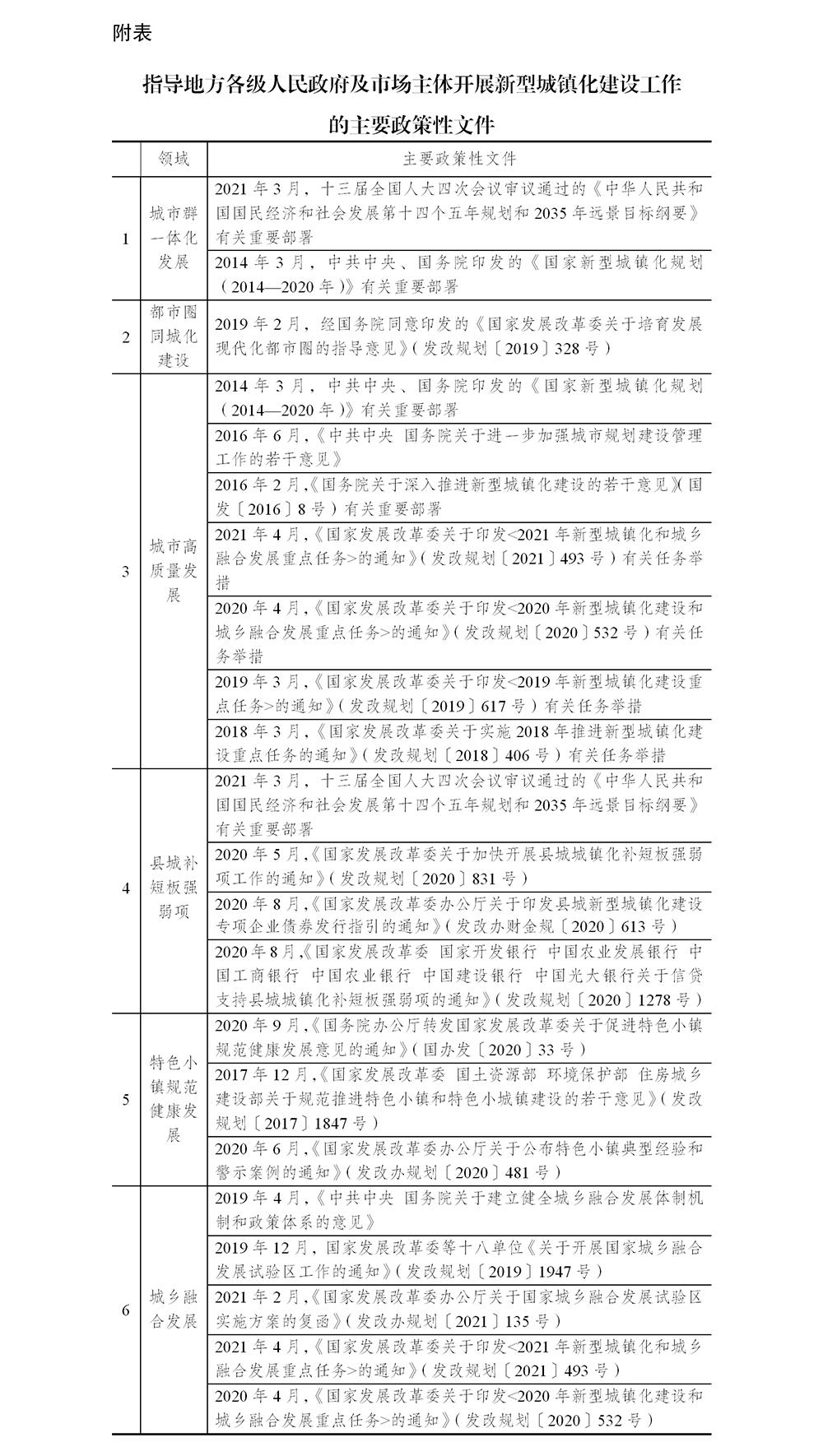 新型城镇化建设工作包括城市群一体化发展、都市圈同城化建设、城市高质量发展、县城补短板强弱项、特色小镇规范健康发展、城乡融合发展等领域。党中央、国务院以及我委等部门制定出台了新型城镇化建设工作一系列政策性文件(详见附表),地方各级人民政府及市场主体可按文件要求科学合理推进。