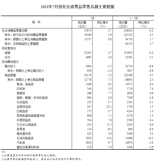 7月份,社会消费品零售总额35870亿元,同比增长2.7%。其中,除汽车以外的消费品零售额32046亿元,增长1.9%。