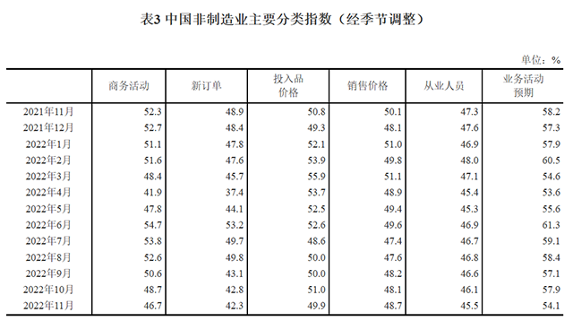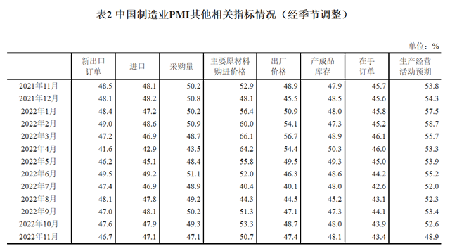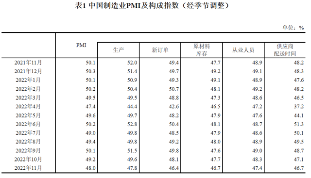 11月份,综合PMI产出指数为47.1%,比上月下降1.9个百分点,低于临界点,表明我国企业生产经营活动总体继续放缓。