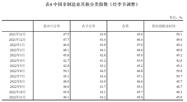 供应商配送时间指数为46.7%,比上月下降0.4个百分点,表明制造业原材料供应商交货时间有所放慢。