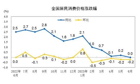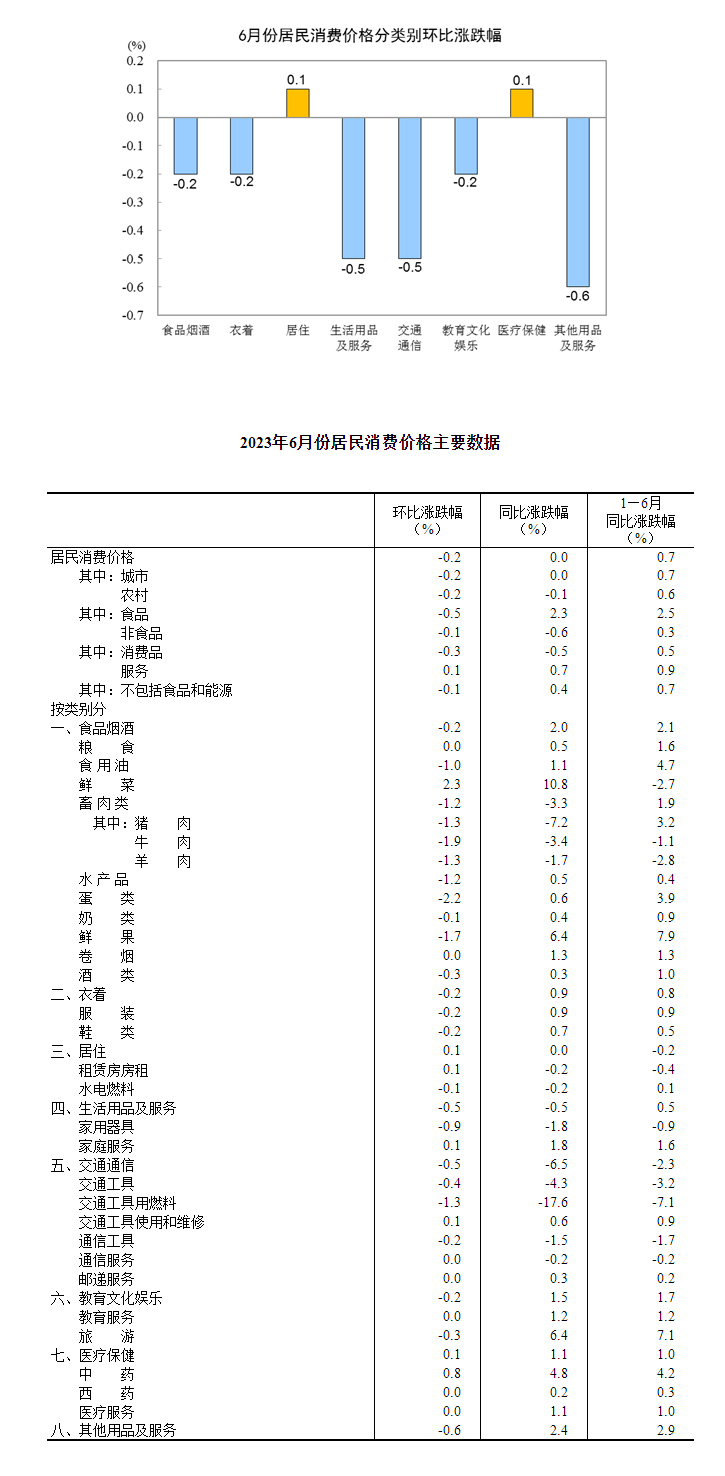2023年6月份,全国居民消费价格同比持平。其中,城市持平,农村下降0.1%;食品价格上涨2.3%,非食品价格下降0.6%;消费品价格下降0.5%,服务价格上涨0.7%。1—6月平均,全国居民消费价格比上年同期上涨0.7%。