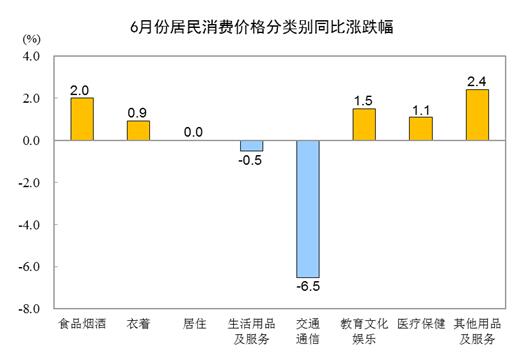 6月份,全国居民消费价格环比下降0.2%。其中,城市下降0.2%,农村下降0.2%;食品价格下降0.5%,非食品价格下降0.1%;消费品价格下降0.3%,服务价格上涨0.1%。