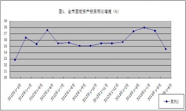 2013年上半年,全市固定资产投资累计完成626亿元,同比增长34.7%,较去年同期下降2.9个百分点(参见图1);完成全年工作目标的40.4%,较去年同期提高了1.4个百分点;增速在全省排名下降到第九位。