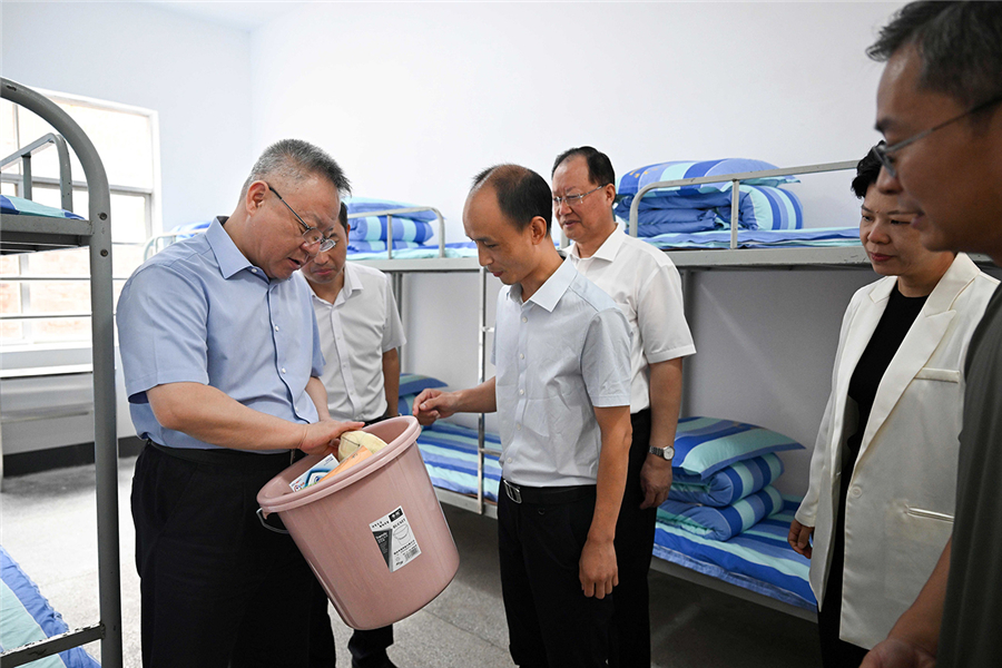 在资兴二中,沈晓明一行现场察看修复后的宿舍、食堂、教室,了解秋季学期开学准备情况,要求扎实做好新学期各项准备工作,不让一名学生因灾辍学失学。来到杨洞水库供水管网坪石桥段抢修点,沈晓明一行听取供水基础设施恢复情况介绍,强调要加快抢修进度,确保水质安全,全力保障群众基本用水需求。