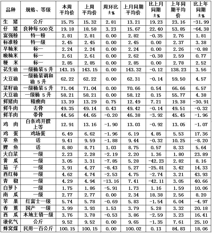 鲜牛肉(去骨)、鲜羊肉(带骨)集市平均价格分别为每500克49.35元、44.56元,较上期分别上涨0.43%、下跌0.20%,较上月同期分别下跌0.14%、3.92%,较上年同期分别下跌0.32%、1.96%。鸡肉(白条鸡开膛上等)、鸡蛋(鸡场蛋)、草鱼、鲤鱼价格总体小幅下跌,集市平均价格分别为每500克12.91元、6.49元、9.41元、8.80元,较上期分别下跌1.90%、下跌1.96%、下跌1.88%、上涨1.03%,较上月同期分别下跌0.92%、上涨4.85%、下跌0.32%、上涨0.57%,较上年同期分别下跌1.07%、上涨17.36%、下跌8.20%、上涨5.64%。